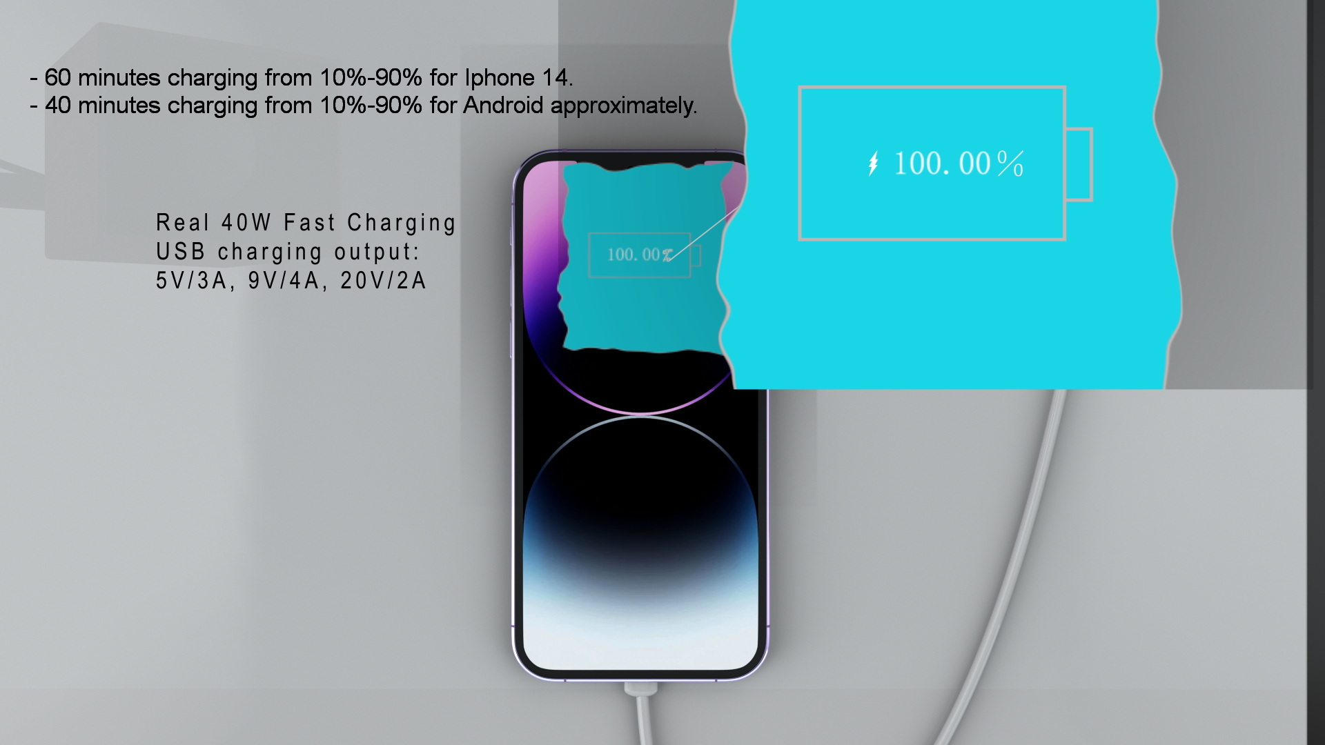 - About 55minutes charging time from 10%-90% for iphone14.